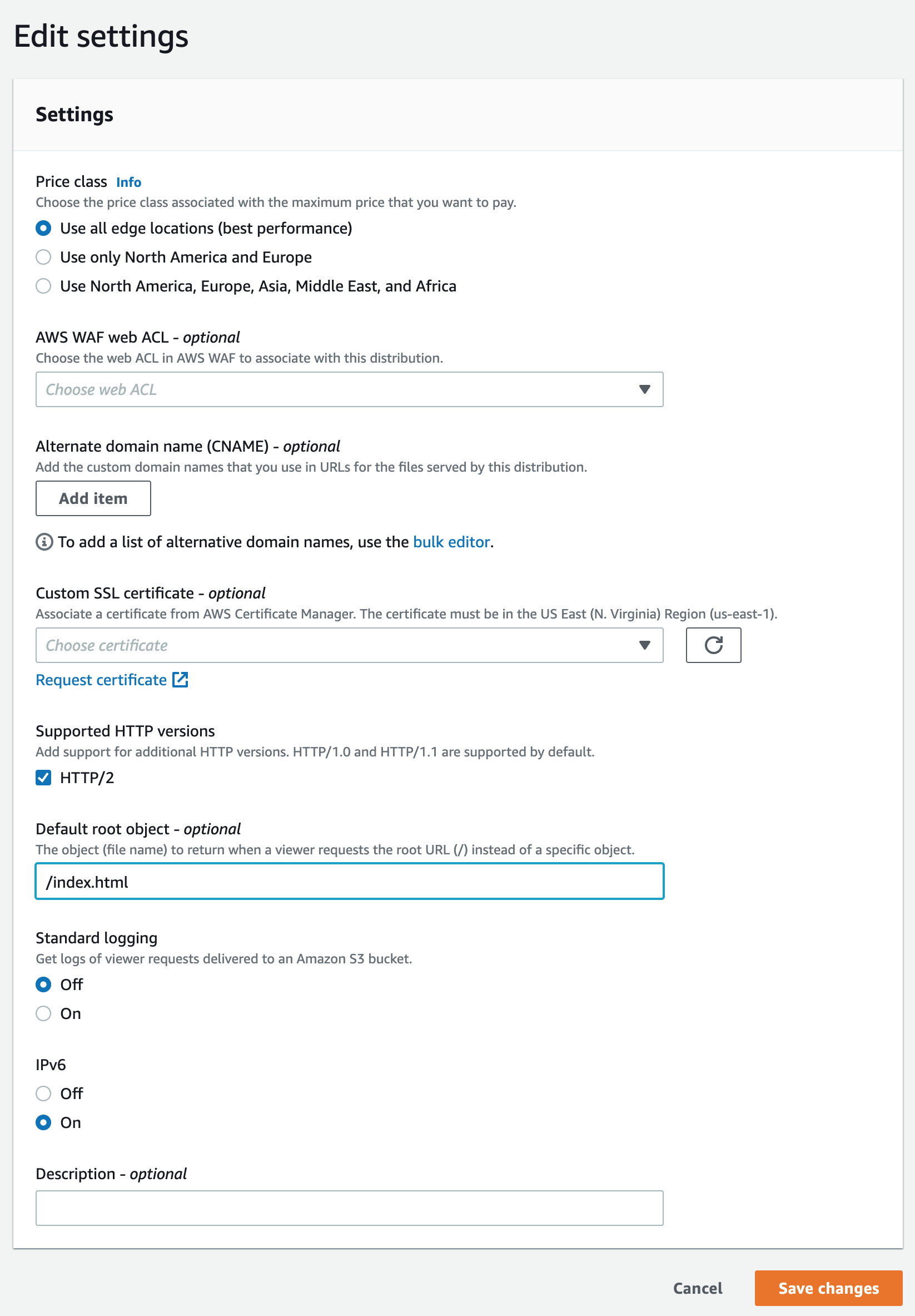 - AWS의 Cloudfront는 기본 24시간동안의 웹 컨텐츠를 캐싱할 수 있다. 이 말인즉슨 배포를 한 번 하고 하루가 지나지 않았는데 또 배포를 한다면 변경사항이 바로 적용되지 않고, 24시간 후에 적용된다. 그렇기 때문에 만약 변경사항을 바로바로 확인해야한다면, Caching Optimized가 아닌 Caching Disabled option을 설정하면 된다.