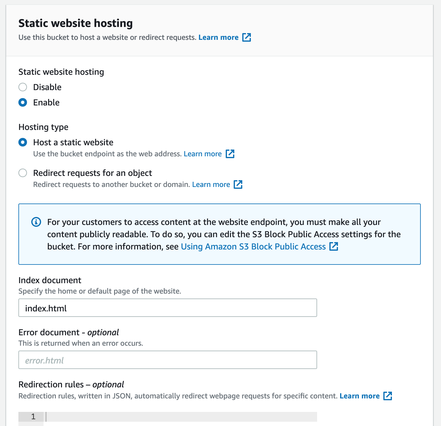 ** 요 아래 Static Website Hosting 부분은 만약 S3 까지만 할 것이라면 사용하고, Cloudfront로 같이 연결할 것이라면 굳이 필요없는 부분이라서 넘어가도 된다! S3정적 호스팅을 해주지 않아도 Cloudfront와 연결하면 알아서 호스팅해주기 때문이다 ㅎㅎ S3는 정말 저장소 역할만 하게되고, Cloudfront가 CDN+Hosting까지 해준다. (참고 - 아마존 공식 홈페이지)