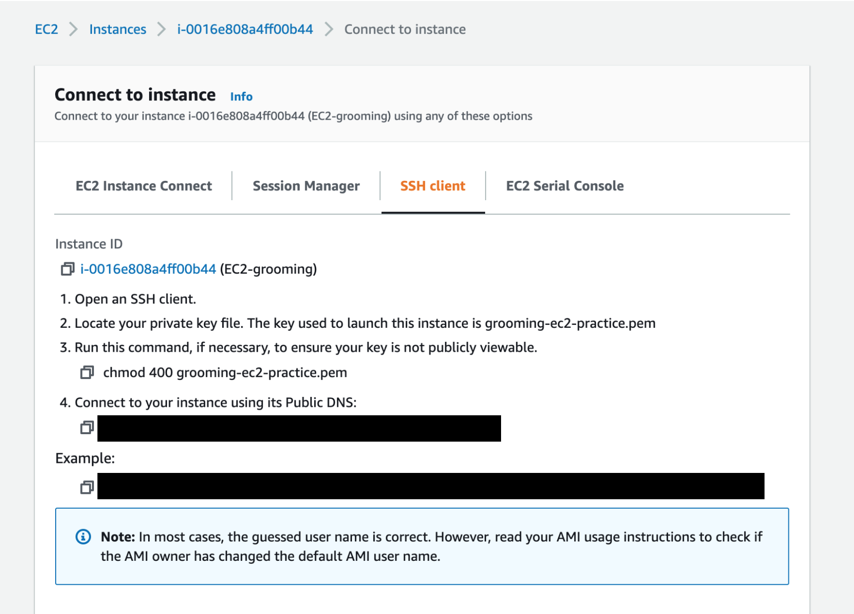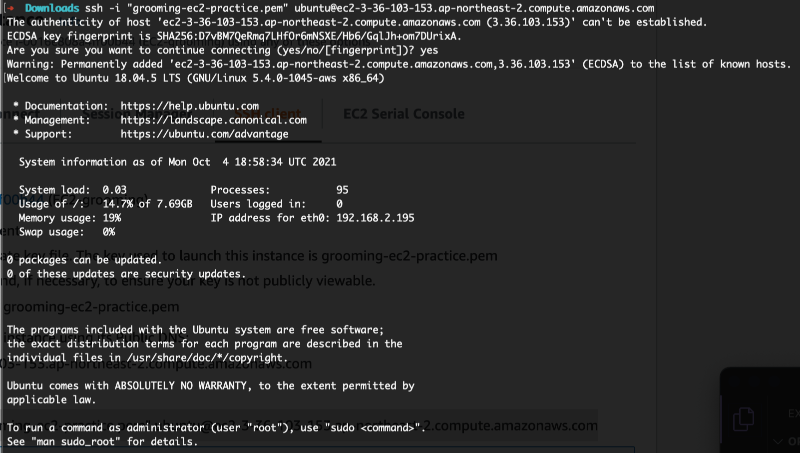 $ ssh -i "grooming-ec2-practice.pem" .......
