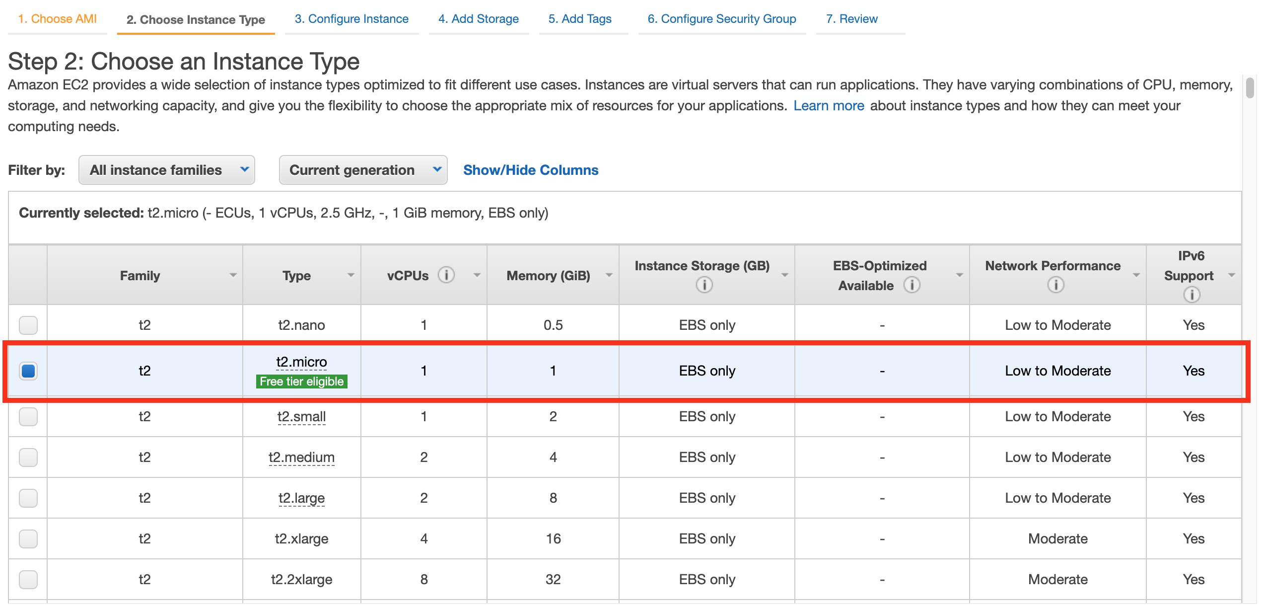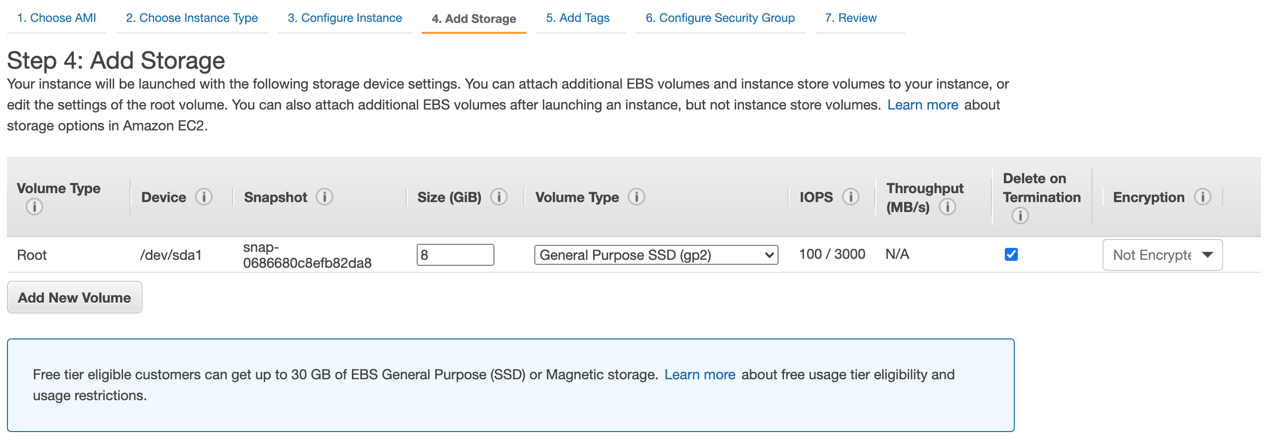 Volumne Type은 General SSD, Provisioned IOPS SSD, Magnetic을 지원하는데, Provisioned IOPS SSD는 추가로 IOPS를 지정할 수 있고 추가비용도 부과될 수 있다. Magnetic은 SSD보다 성능이 좀 떨어진다고 한다. 그래서 General SSD를 사용했다.