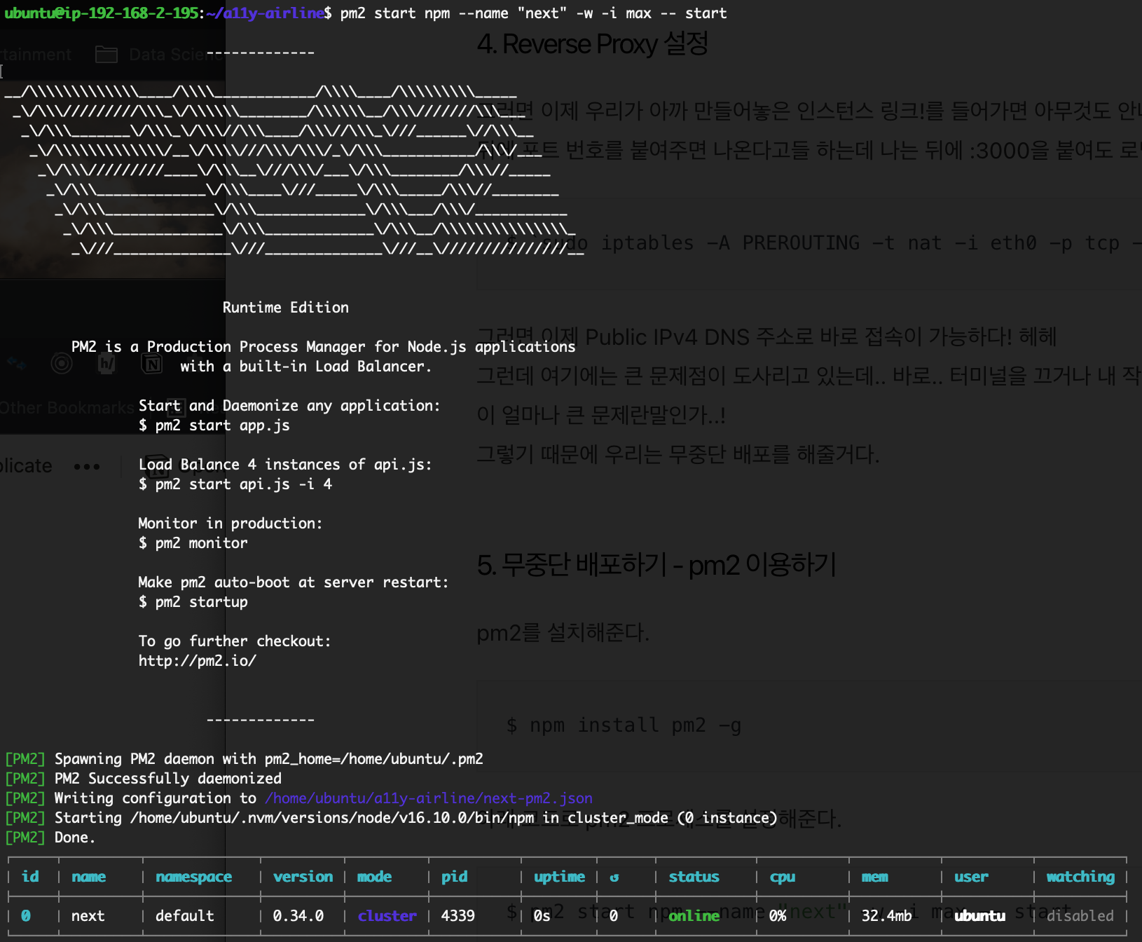 무중단 배포를 위한 방법은 정말 여러가지가 있지만, 나는 그 중에서 (가장 쉬워보이는) pm2를 사용했다.