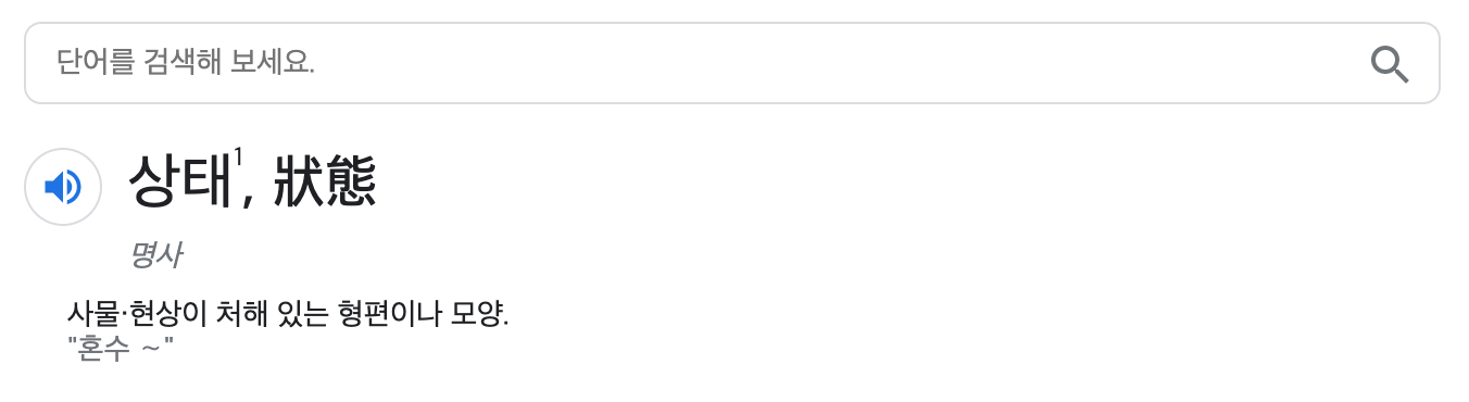 먼저, 상태의 뜻에 대해 알아보자. 상태란, 사물이나 현상이 처해있는 형편이나 모양을 뜻한다. 이것만 보면 사실 감이 잘 안온다.