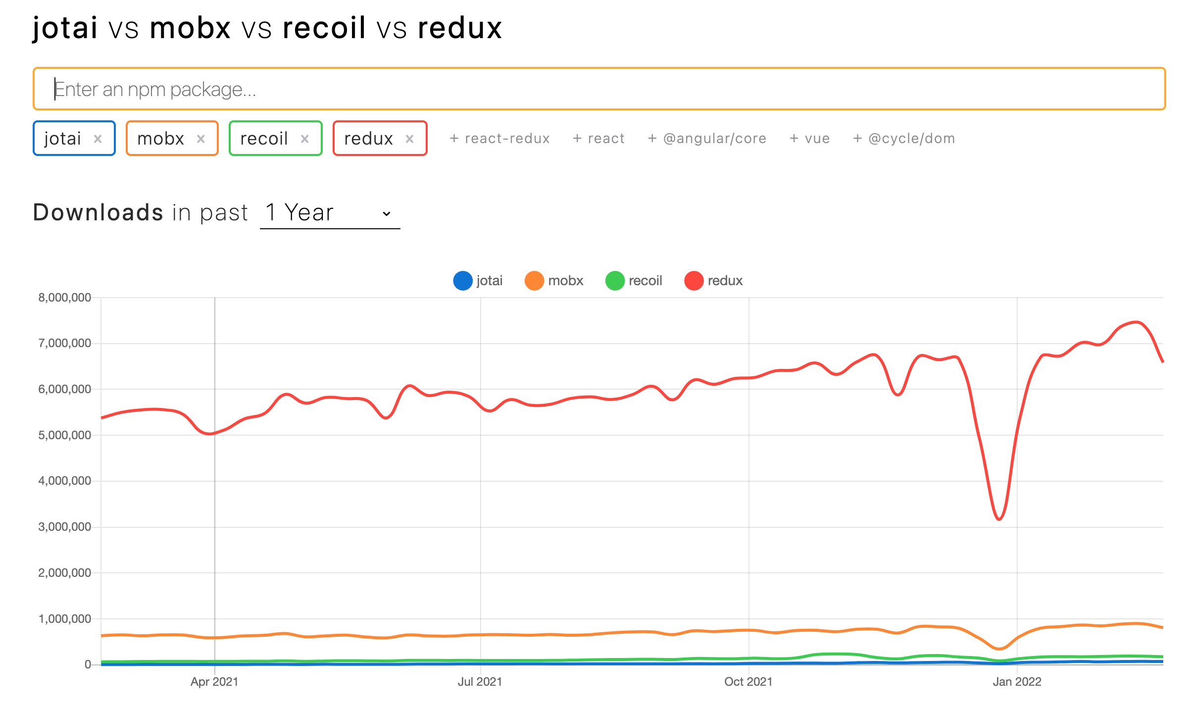 아래는 npm trends 사이트에서 Hot한 상태관리 툴들의 다운로드 수를 비교해 본 것이다. 다양한 상태관리 툴들의 등장으로 Redux의 인기가 떨어지고 있다고들 하기는 하지만, 사실 뭐 아직까지 리덕스.. 가장 많이 쓰이긴 한다. ㅋㅋㅋㅋ 프론트엔드 개발자라면 꼭 한번 배워보는 것이 좋을 것 같다.