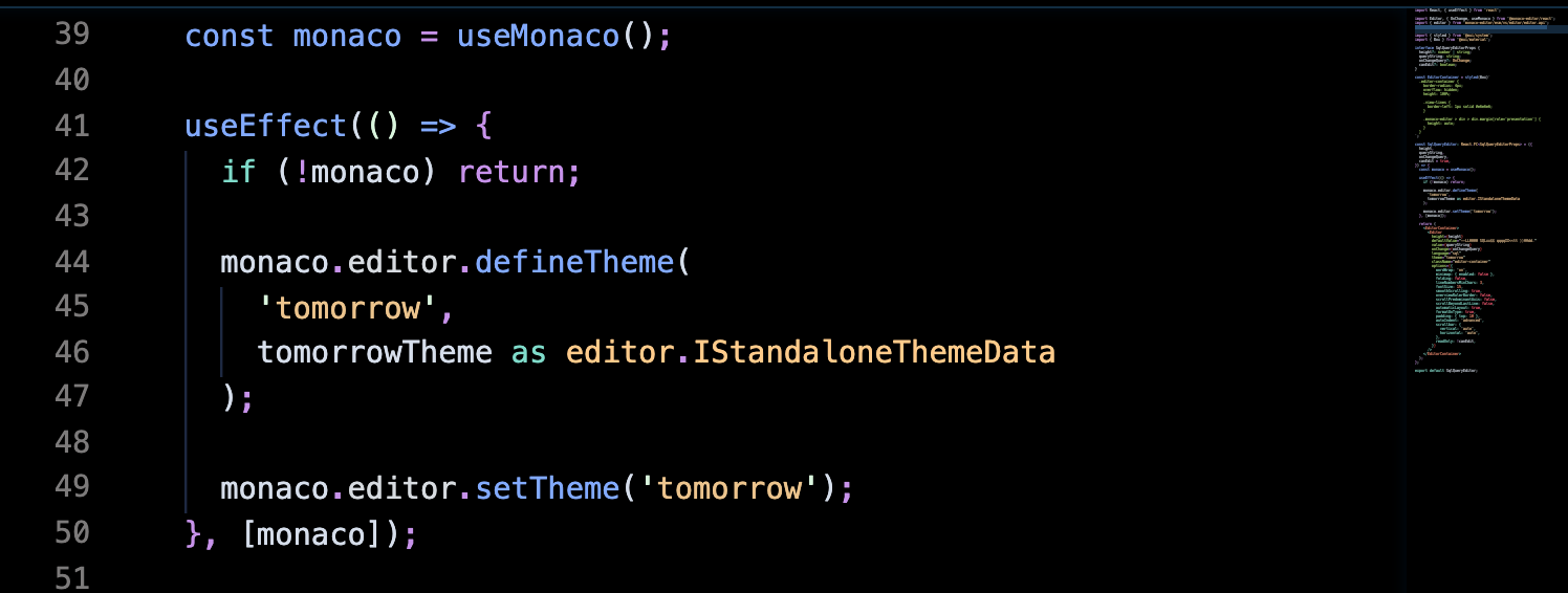 이런 테마를 적용하려면 먼저 useMonaco Hook을 사용해 monaco 인스턴스를 만들어 사용해야한다.