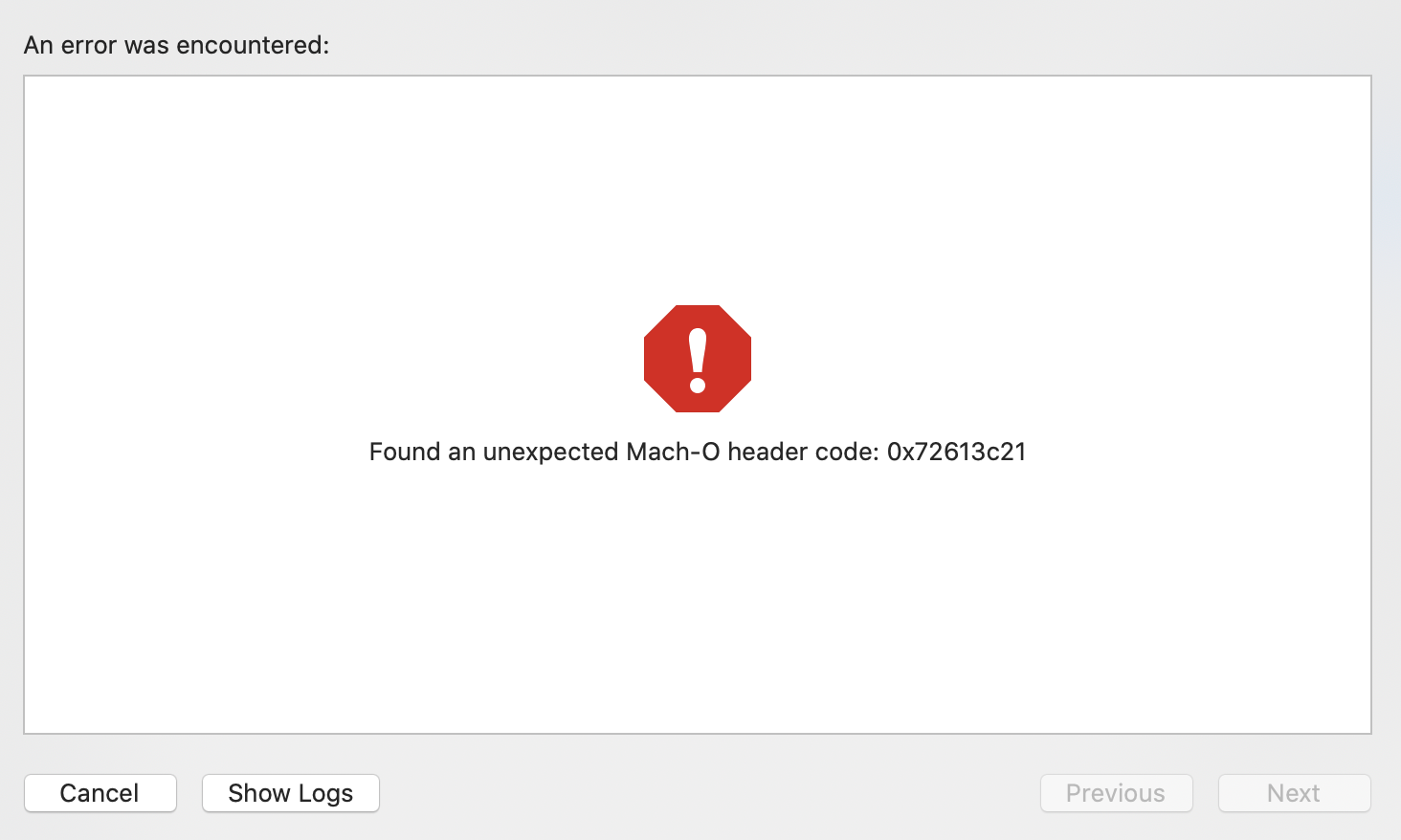 [iOS] Mach-O header code 0x72613c21 에러 해결하기